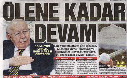 Hürriyet aksine, büyük devlet adamı Erbakan’ın arkasından “Ölene kadar devam” şeklinde manşet attı. Hürriyet manşetten “Kalp yetmezliğinden ölen Erbakan, ‘kalbimde pil var diyerek’ siyasetten affını isteyen bir partiliye, ‘pil bitene kadar devam’ demişti” diye yazdı.