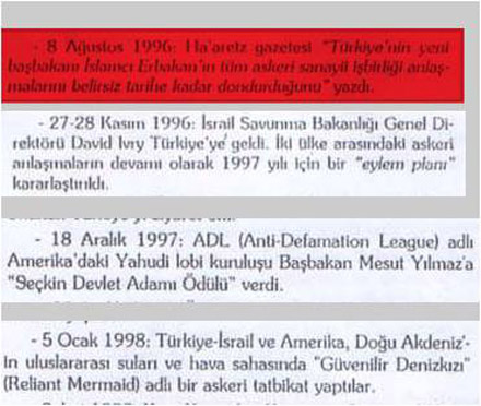 Alptekin Dursunoğlu’nun “Stratejik İttifak” isimli kitabında Türkiye İsrail anlaşmaları Kronolojisinden: Erbakan Tüm Anlaşmaları Askıya Aldı. Haber Kaynağı: İsrail Ha’arets Gazetesi