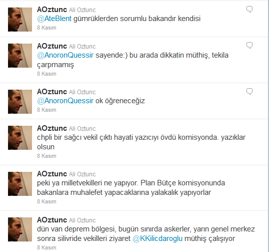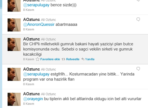Öztunç tiwitter hesabında ayrıca “Bir CHP’li milletvekili Gümrük Bakanı Hayati Yazıcıyı Plan Bütçe komisyonunda övdü. Sebebi o sağcı vekilin şirketi ve gümrük kaçakçılığıdır” ifadelerine yer verdi.