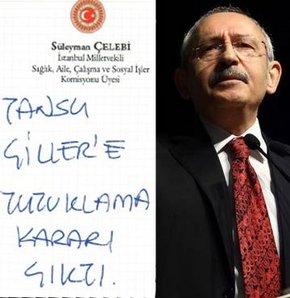 CHP Genel Başkanı Kemal Kılıçdaroğlu'nun gafına neden olan notun CHP'li Süleyman Çelebi'ye ait not kâğıdına yazıldığı ortaya çıktı. "Tansu Çiller'e tutuklama kararı çıktı" notuyla ilgili Çelebi, "MİT'çilere tutuklama kararı bilgisi ulaşınca Genel Başkan'a iletilmesini istedim. O arada sözüm yanlış algılanmış" dedi.