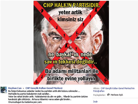 Sayfada Önder Sav’ın yağlıboya ile yapılmış bir resmi bulunuyor. Resmin üzerine bazı çevrelerce “ölüm işareti” olarak yorumlanan çarpı işareti çekilmesi dikkat çekiyor. Fotoğrafın üzerinde ise ağır ifadeler yer alıyor: “CHP halkın partisidir. Yeter artık kimsiniz siz. CHP ne Baykal’ın ne de Sav’ın tekkesi değildir. Bu adamları militanlarıyla birlikte evlerine yollayın.”