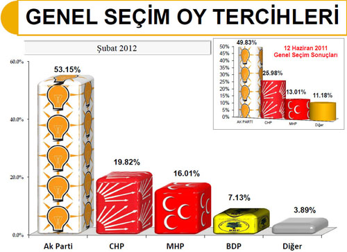 2012'nin ilk 2 ayında yapılan anketlerde olduğu gibi, son açıklanan anket sonuçlarında da AK Parti yüzde 50'nin üzerinde oy alarak en yakın rakibine yüzden 30'dan fazla fark attı.