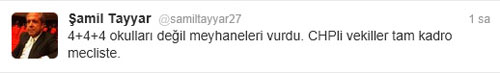 AK Parti Gaziantep Milletvekili Şamil Tayyar'ın Twitter'a ''Dört artı dört okulları değil meyhaneyi vurdu. CHP vekiller tam kadro Meclis'te'' yazdığını aktaran İnce, ''Bu yazıdan dolayı Şamil Tayyar, CHP grubundan özür dilesin'' dedi.