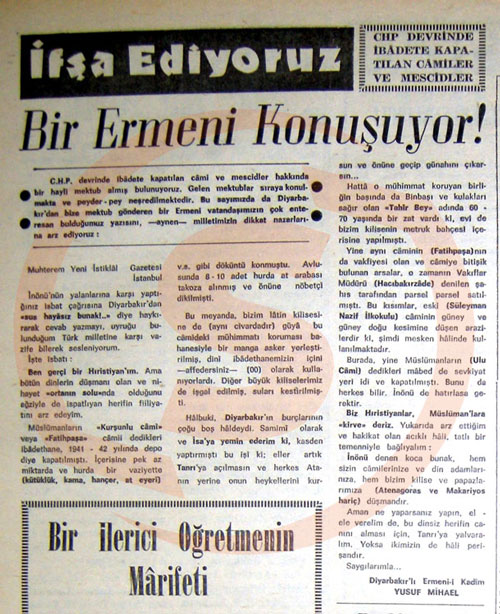 İspat çağrısına Diyarbakır'dan haykırarak cevap yazmayı vazife bilerek sesleniyorum. Ben Hristiyan'ım ama Müslümanların Kurşunlu Camii ve Fatih Paşa Camii dedikleri ibadethane depo yapılıp kapatılmıştı. İçinde kütüklük, kama, hançer vs. gibi döküntü vardı. Latin Kilisesi'ne de bir manga asker yerleştirilmiş dini ibadethanemiz için tuvalet olarak kullanıyorlardı. Kılıçdaroğlu bak bunları iyi öğren. Muğla'dan bir vatandaş camide kadın oynatılıp şarap içilmiştir diyor. Kahramanmaraş'tan şunları yazıyor: Caminin açık kalan kapısından giren hayvanlar burayı ahır haline getirdi. Bir mektupta 'Sayın Muhalefet Lideri İnönü hiçbir cami kapatılmamıştır diye yalan söyleyerek milleti yanıltmak istemektedir. Balıkesir'de bir cami müstesna bütün camiler kapatıldı. İçlerine askeri malzeme depo edildi. Bu millet eski aç sefil günlerine dönmek niyetinde değildir. Senin zamanında çarık alamayan köylü şimdi ayakkabı giyiyor. Bizi artık rahat bırak. Kazandığımız hürriyeti bize çok görme paşam' diyor.