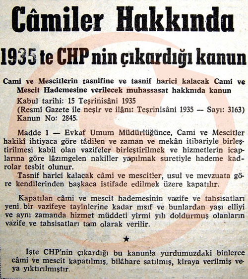 Belge 1. Camilerin satışını mümkün hale getiren yasa. Kanunda şu ifade var: Tasnif harici cami ve mescitler kendilerinden başkaca istifade edilmek üzere kapatılır. Bu kanunla birlikte camiler kapatılmaya başlanıyor.