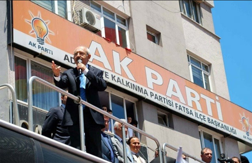 Fatsa AK Parti ilçe binasındaki levha ile Kılıçdaroğlu'nun aynı kareye gelmesi ilginç bir enstantane oldu.