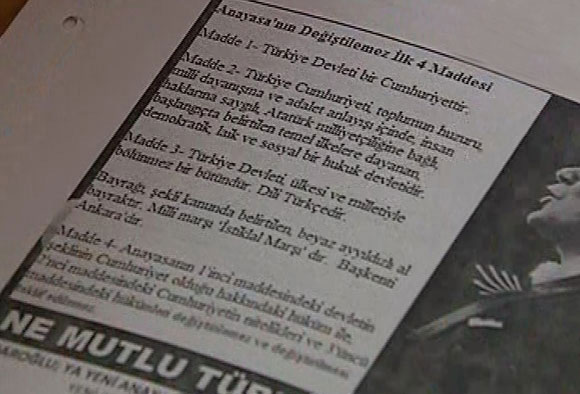 Bildiride, Anayasa'nın ilk 4 maddesinin kesinlikle değiştirilemeyeceği vurgulandı. CHP'nin bölücülükten yana bir tavır içinde olduğu öne sürüldü. "Yeni Osmanlı yeni CHP yeni Anayasa'ya hayır" ifadesi kullanıldı. (CNNTÜRK)
