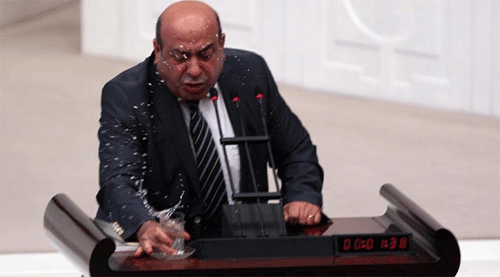 Konuşması sırasında sinerlenen Kaplan, önündeki bardığı kürsüye vurdu.