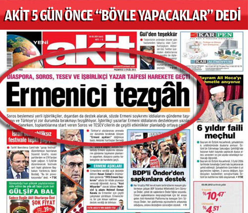 Akit, 3 Eylül tarihli sayısında manşetten, şöyle diyordu: “Türkiye, son dönemde iç ve dış gelişmelerle kritik süreçlerden geçerken, ‘gizli bir el’ Ermeni konusuna kafa yormaya başladı. Son dönemde Ermeni meselesi bağlamında bir hareketlilik yaşandığı göze çarpmakta. Yeni gelişmeler bağlamında Ermeni meselesinin önümüzdeki dönemde ülkemiz aleyhinde kamuoyu gündeminde önemli bir yer işgal edebileceği değerlendirilmekte. Bahse konu faaliyetlerin yoğunlaşmasında sözde soykırımın 100. yılının yaklaşmasının etkili olduğu değerlendirilmekte”