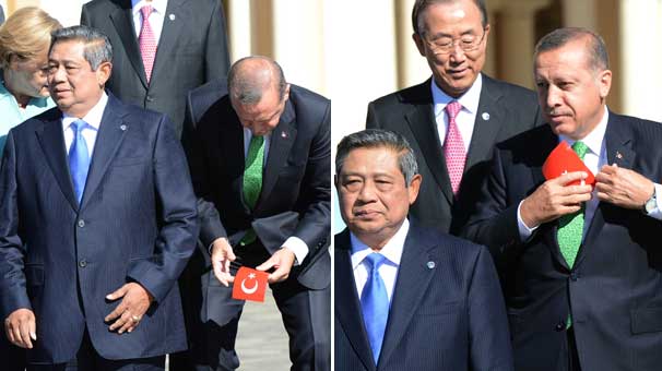 Başbakan Erdoğan, diğer zirvelerde yaptığı gibi yine fotoğrafın çekildiği alandaki yerde bulunan Türk bayrağını yerden alarak cebine koydu. Sonra bütün liderlerin katıldığı aile fotoğrafı çekildi.