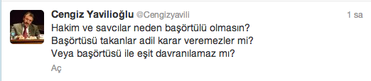 Cengiz Yavilioğlu, Türk Silahlı Kuvvetleri, Emniyet ve Yargı mensuplarının kapsam dışı tutulduğu başörtüsü yasağının kaldırılması konusundaki tepkisini,twitter hesabından yazdığı notla eleştirdi.