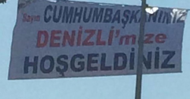 Denizli- Ankara karayolu Pınarkent Mahallesi girişine park edilen bir vince, 'Cumhumbaşkanım Denizli'ye hoşgediniz' yazılı pankart asıldı. Denizli mitingi için kentte gelen Başbakan ve Cumhurbaşkanı adayı Recep Tayyip Erdoğan'a hoşgeldin mesajı veren ve kimin astığı bilinmeyen pankarttaki harf hatasını fark eden bir kişi fotoğrafını çekip sosyal medyada paylaştı. Hata sosyal medyada günün konusu haline geldi.