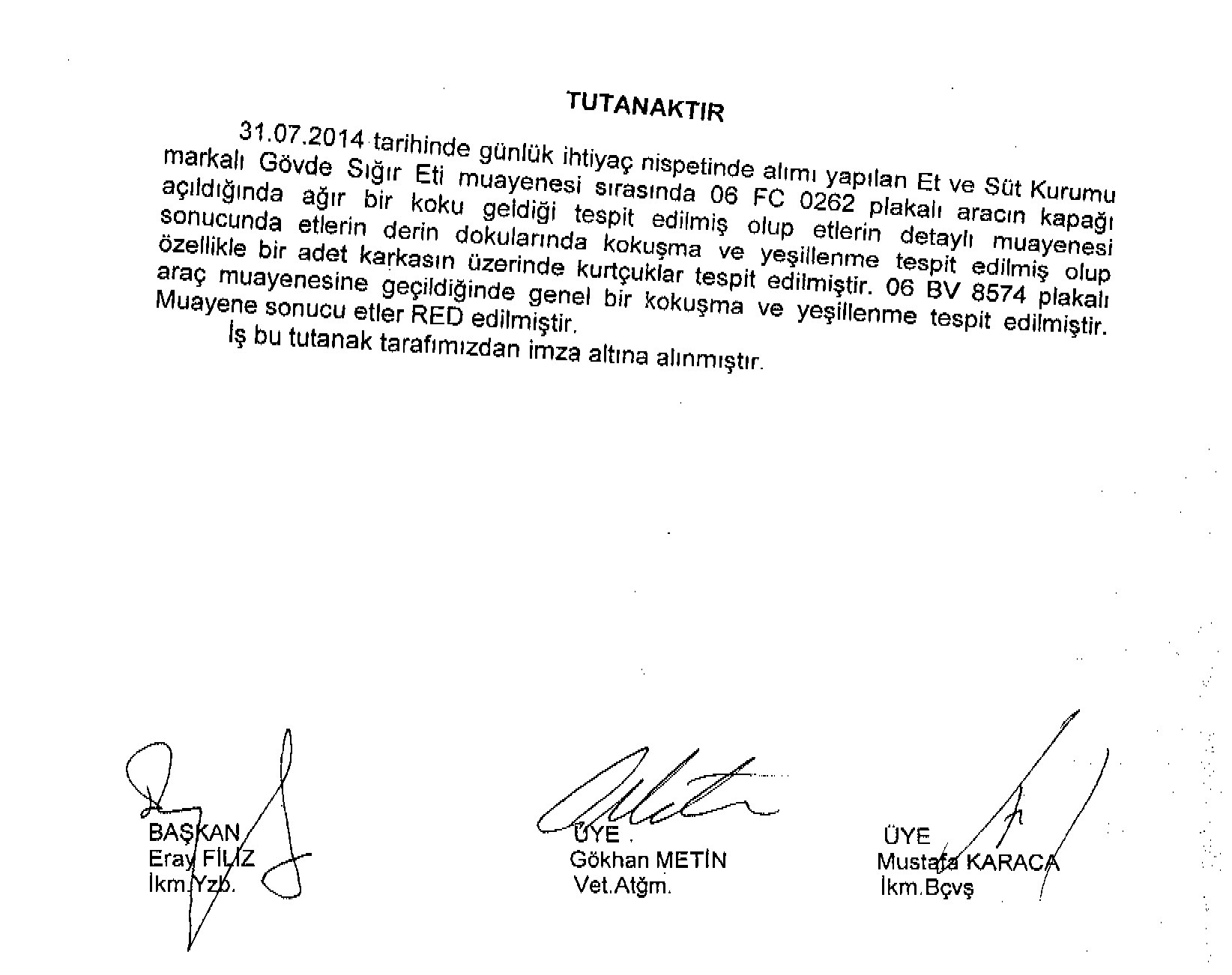 "31 Temmuz 2014 tarihinde günlük ihtiyaç nispetinde alımı yapılan Et ve Süt Kurumu markalı Gövde Sığır Eti muayenesi sırasında 06 FC 0202 plakalı aracın kapağı açıldığında ağır bir koku geldiği tespit edilmiş olup etlerin detaylı muayenesi sonusunda etlerin derin dokularında kokuşma ve yeşillenme tespit edilmiş olup özellikle bir adet karkasın üzerinde kurtçuklar tespit edilmiştir. 06 BV 8574 plakalı araç muayenesine geçildiğinde genel bir kokuşma ve yeşillenme tespit edilmiştir. Muayene sonucu etler RED edilmiştir."