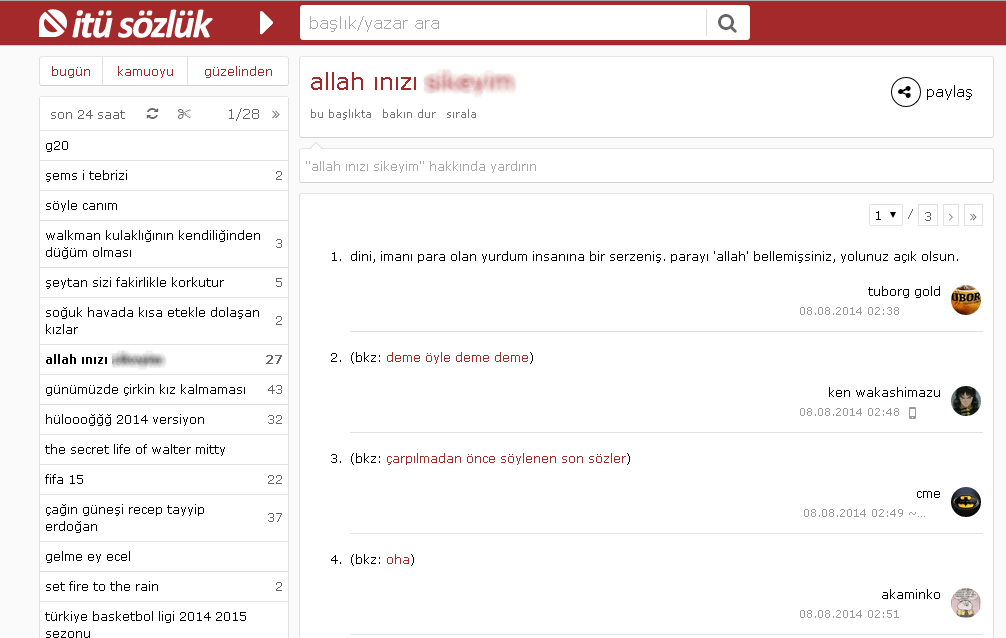 Ekşi Sözlük, Uludağ Sözlük gibi sitelerin ardından İtü Sözlük’te de hemen hergün Allah’a, İslam’a, Hz. Peygamber’e, dindarlara, başörtülülere açık açık küfrediliyor; hakaret yağdırılıyor; aşağılayıcı ifadeler sarf ediliyor; devlet görmüyor, duymuyor.