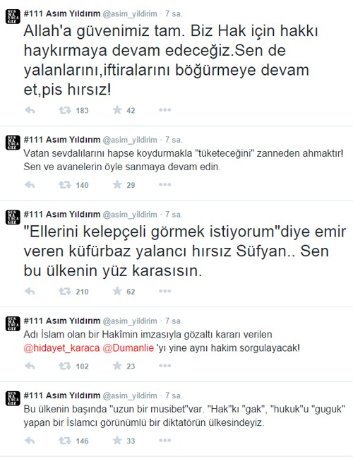 Cumhurbaşkanı Erdoğan'a "Pers uşağı, ikinci evci, şaklaban, şizofren, hırsız, vatan haini, sahtekar, yamuk, dindar görünümlü vahşi" gibi hakaretlerde bulunan Yıldırım'ın Twitter'daki bu mesajları büyük tepki toplamıştı.