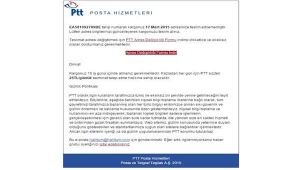 Vatandaşlara PTT Kargo’nun mail adresinden kargo takip numarasıyla ‘Kargonuz teslim edilememiştir’ başlığıyla mail atan dolandırıcılar, vatandaşların adres bilgilerini güncelleyip kargolarını alabilmeleri için ‘PTT Adres Değişikliği Formu’nu doldurmalarını istiyor. Kargonun 15 gün içinde alınmaması halinde fazladan her gün için 25 TL tazminat talep edileceğini vurgulayan dolandırıcılar, link vasıtasıyla vatandaşları form doldurmaya zorluyor.